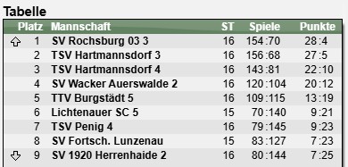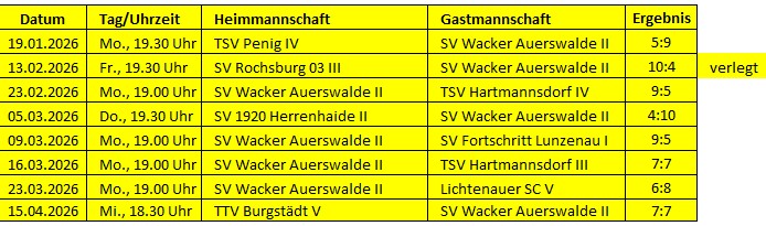 Am Montag, 17. November 2025, 19.00 Uhr in Niederlichtenau gegen TSV Penig IV 2:4, SpVgg. Zethau II 3:4.